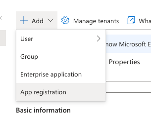 The first step is to create a new App Registration. Navigate to the Microsoft Entra ID service and choose Add -> App Registration.