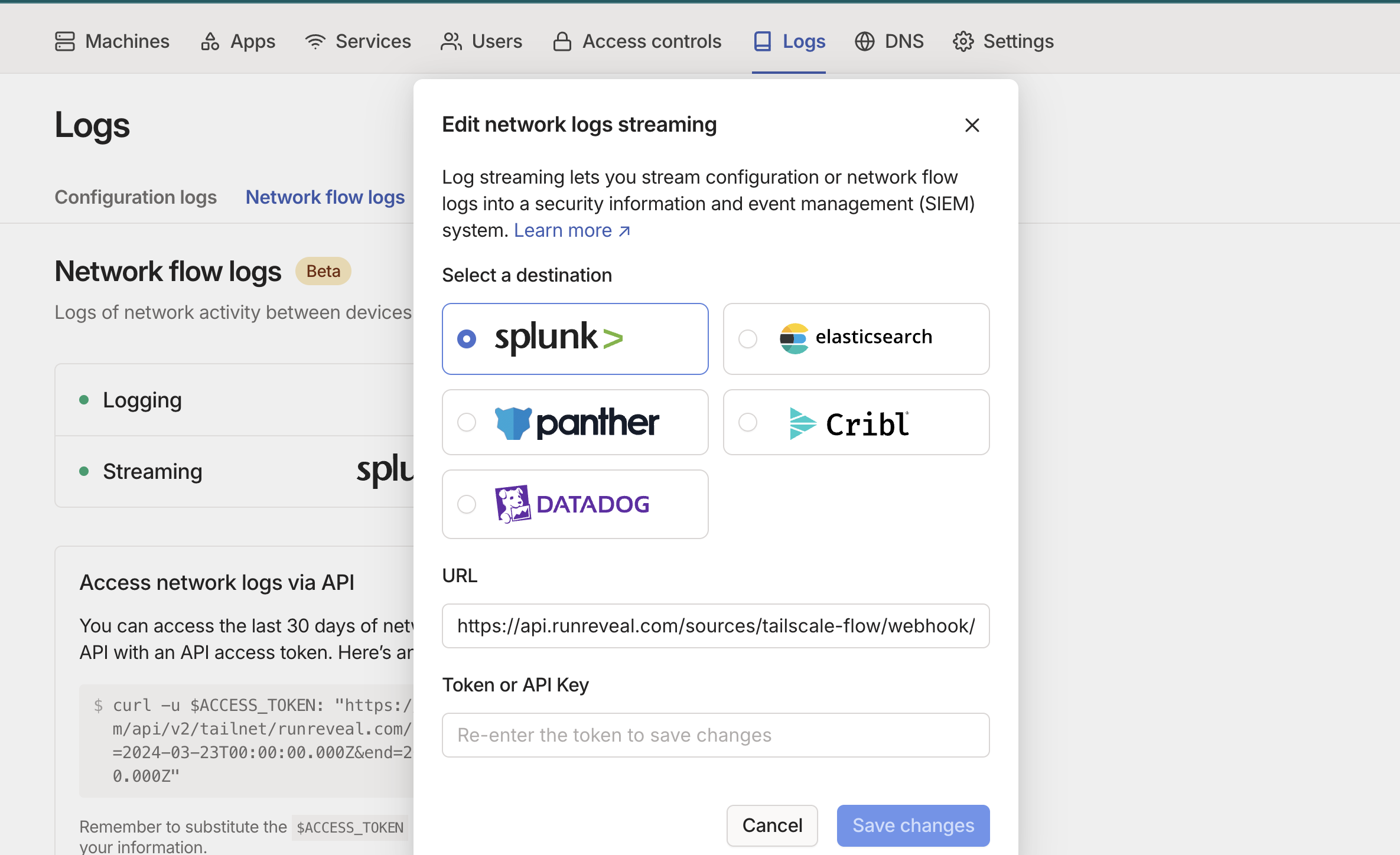 Once you’re assigned a webhook URL, in Tailscale’s Logs product, select “Network logs”, create a Splunk streaming destination, and set RunReveal’s webhook URL as your webhook URL without any Token or API key.